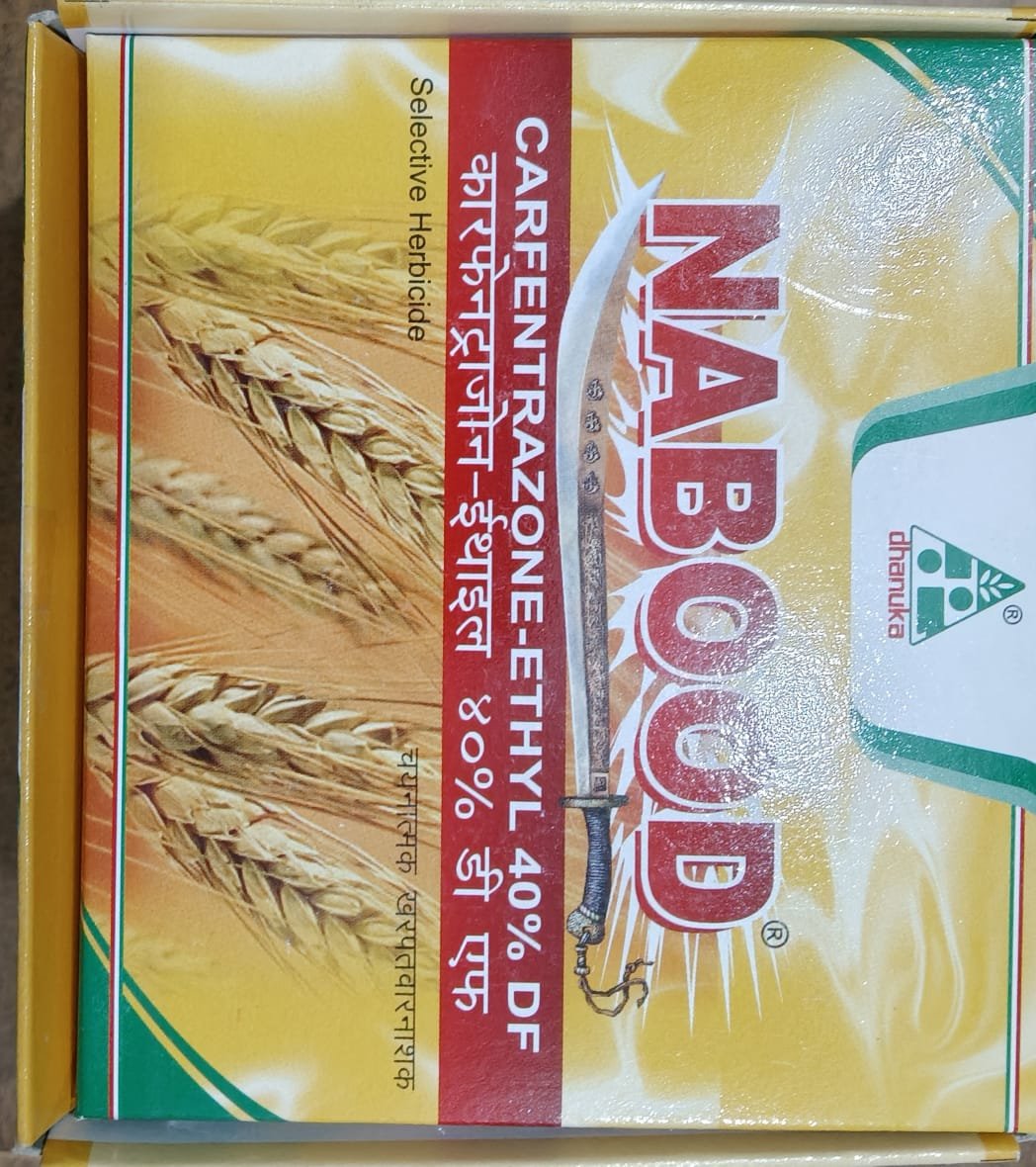 Nabood herbicides are post-emergent, foliar herbicides designed to manage broadleaf weeds in wheat and direct-seeded rice. They are effective against a wide range of broadleaf weeds, including key weeds like Chenopodium album, Melilotus Indica, Melilotus alba, and Medicago denticulata. Nabood is known for its excellent crop safety and compatibility with most grass herbicides used in wheat crops. It acts by inhibiting the Protoporyphyrinogen Oxidase (PPO) enzyme in target weeds, leading to quick knockdown and immediate cell membrane collapse. Nabood is available in various forms, including granules and as a dispersible granule (DF) containing 40% carfentrazone ethyl. It can be applied as a foliar spray or a soil drench, with specific dosage instructions provided on the product label