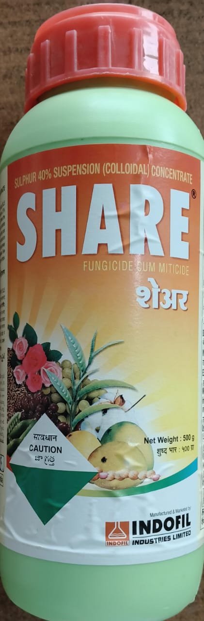 Indofil Share is a broad-spectrum contact fungicide developed by Indofil Industries Ltd. It effectively controls and prevents powdery mildew and other fungal diseases in various crops, including vegetables and fruits. The active ingredient in Share is 40% Sulfur, which works by disrupting cellular processes in fungal cells, leading to their death.